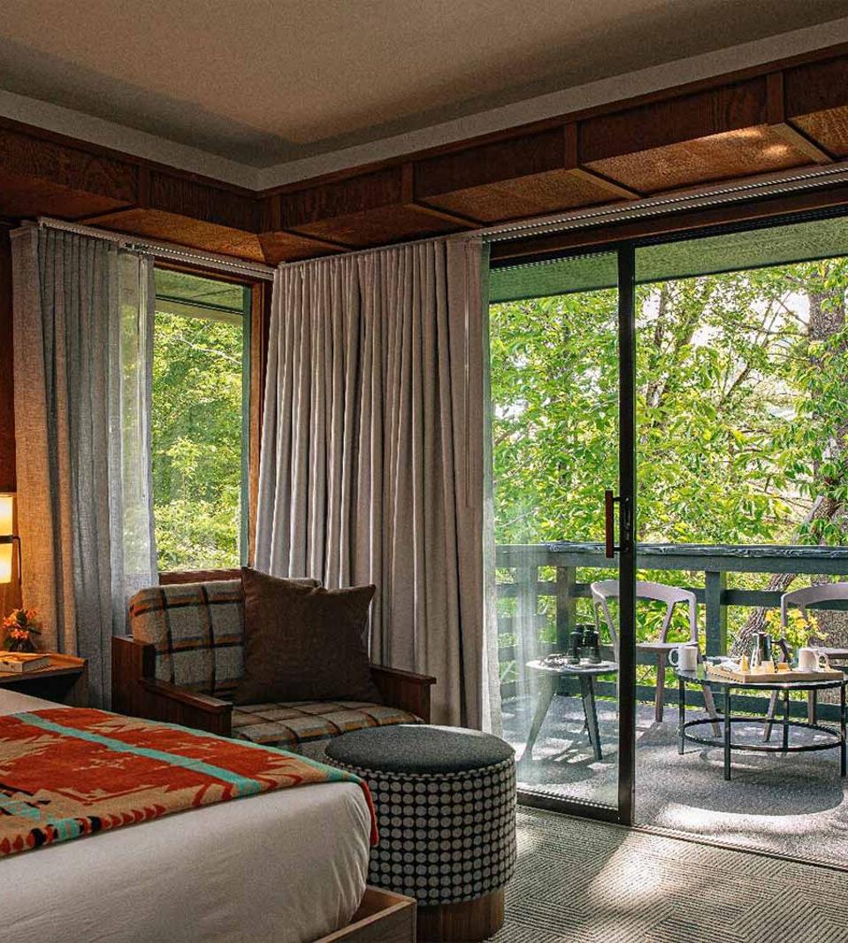 Skyline Lodge is nestled in an Appalachian temperate rainforest and is surrounded by green treetops, two nearby waterfalls and rolling mountain views. Skyline’s reimagined motor lodge layout naturally encourages guests to spend as much time outside as possible, with its exterior corridor, ample patio space and communal outdoor courtyard with string lights. Inside the rooms and the on-property restaurant Oak Steakhouse, interior design by Mey & Co, pick up where the surrounding nature ends, with terracotta flooring, original stone walls and fireplaces, and organic, natural, and textural elements (cork headboards, exposed stonework, woven textiles, and wooden furniture). Throughout the spaces, a calming color palette of greens and neutrals reign, while floor-to-ceiling windows and balconies in every room pull the outside in and allow guests to feel truly immersed in the nature just beyond.