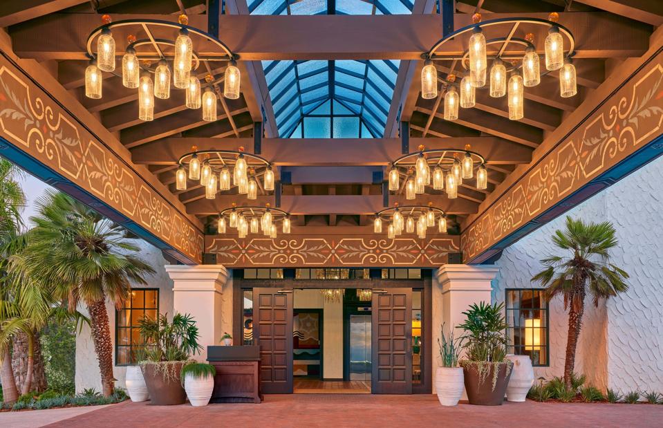 Mirroring the rise of the tide, the hotel’s spaces effortlessly flow from indoors to outdoors across three acres of Spanish-influenced grounds, from the hotel lobby and living room, to meeting & event spaces, dining concepts and outdoor terraces. Los Angeles-based Beleco led the interior design of Mar Monte Hotel. Bright white walls create an airy and welcoming atmosphere in the lobby and living room. Exposed beam ceilings and arches are complemented by feature chandeliers, terracotta tiled flooring and a large-scale ceramic tile art installation behind the reception desk, bringing Spanish-style elements into the space in a muted earthy color palette.