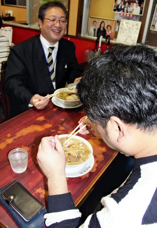 The company employee and Funakubo ate a dish recommended by Funakubo at the Koshu Hanten restaurant in Tsubame, which is said to be the originator of seabura ramen.