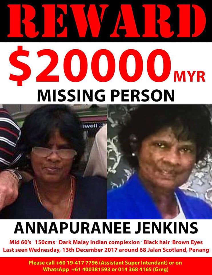 Anna Jenkins, 65, — also known as Annapuranee — went missing in Penang in December 2017 while on a trip with her husband, Frank Jenkins, to visit her mother.