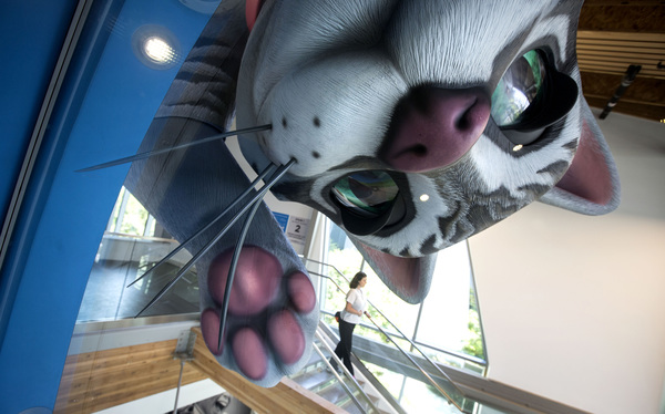 LOS ANGELES _ Don't forget to look up as you enter the new Annenberg PetSpace: There's a ginormous motion-sensor sculpture of a wriggling pup, so happy to see you. Look to the right for its feline counterpoint: A curious kitty, poised to paw its prey.