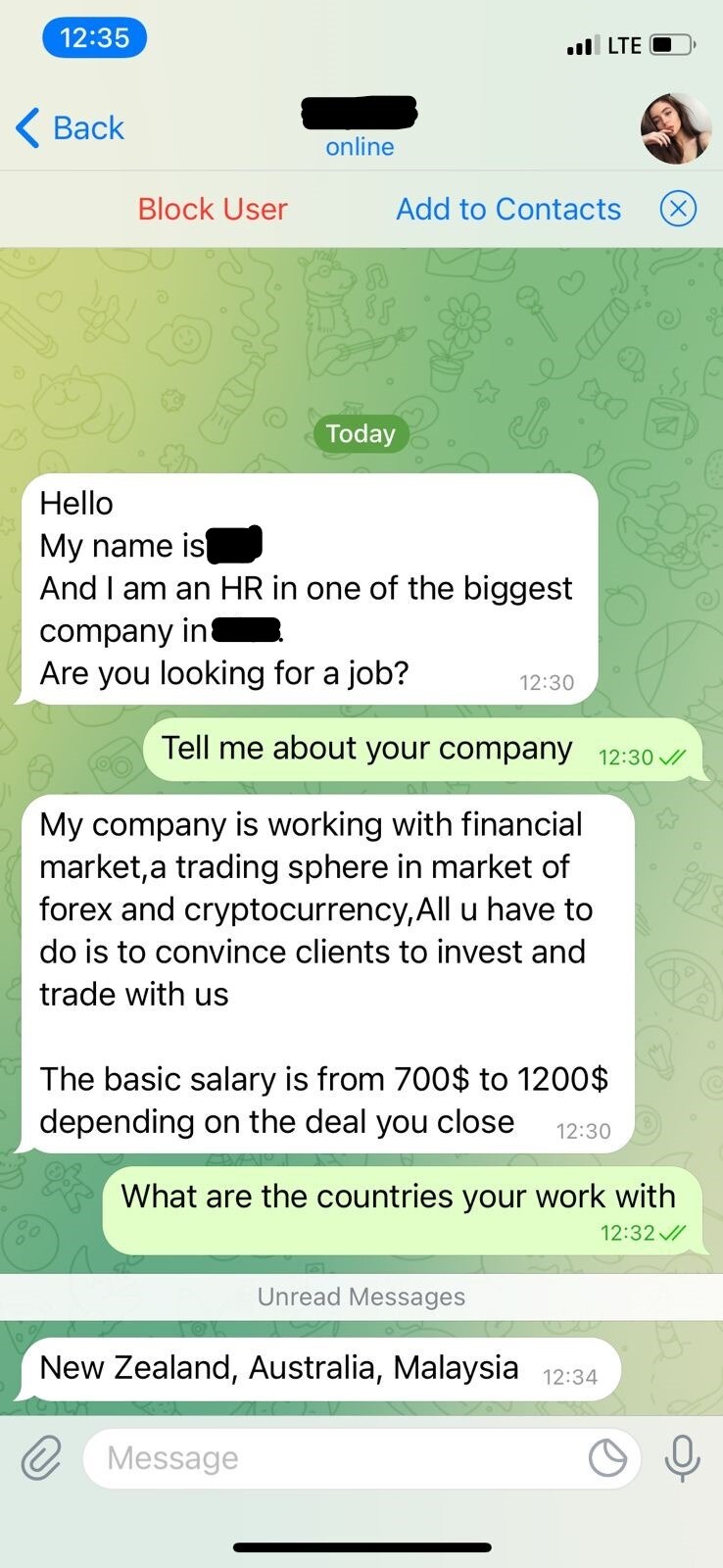 - If you feel you may be dealing with a scammer, stop talking to them and block them.