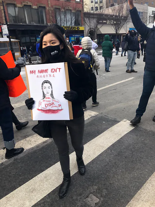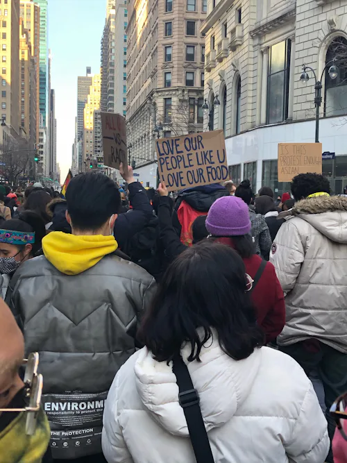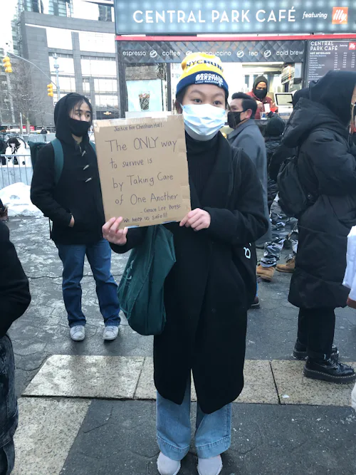 The overwhelming message of the rally that we have shown up for — in masks and heavy coats amid icy snowdrifts — is one of a united collective, an intersectional fight against racism and white supremacy. I saw signs that read: “We Are Not Your Scapegoat,” “LOVE OUR PEOPLE LIKE U LOVE OUR FOOD,” and “The ONLY way to survive is by taking care of one another," a quote from the prominent Asian American labor activist Grace Lee Boggs. A black-clad protester in front of me wore a button on their backpack that read, “Silence is complicity.” Organizers dispersed through the crowd chanted into megaphones: “Justice for Asian people” and “This is what Asian Power looks like!”