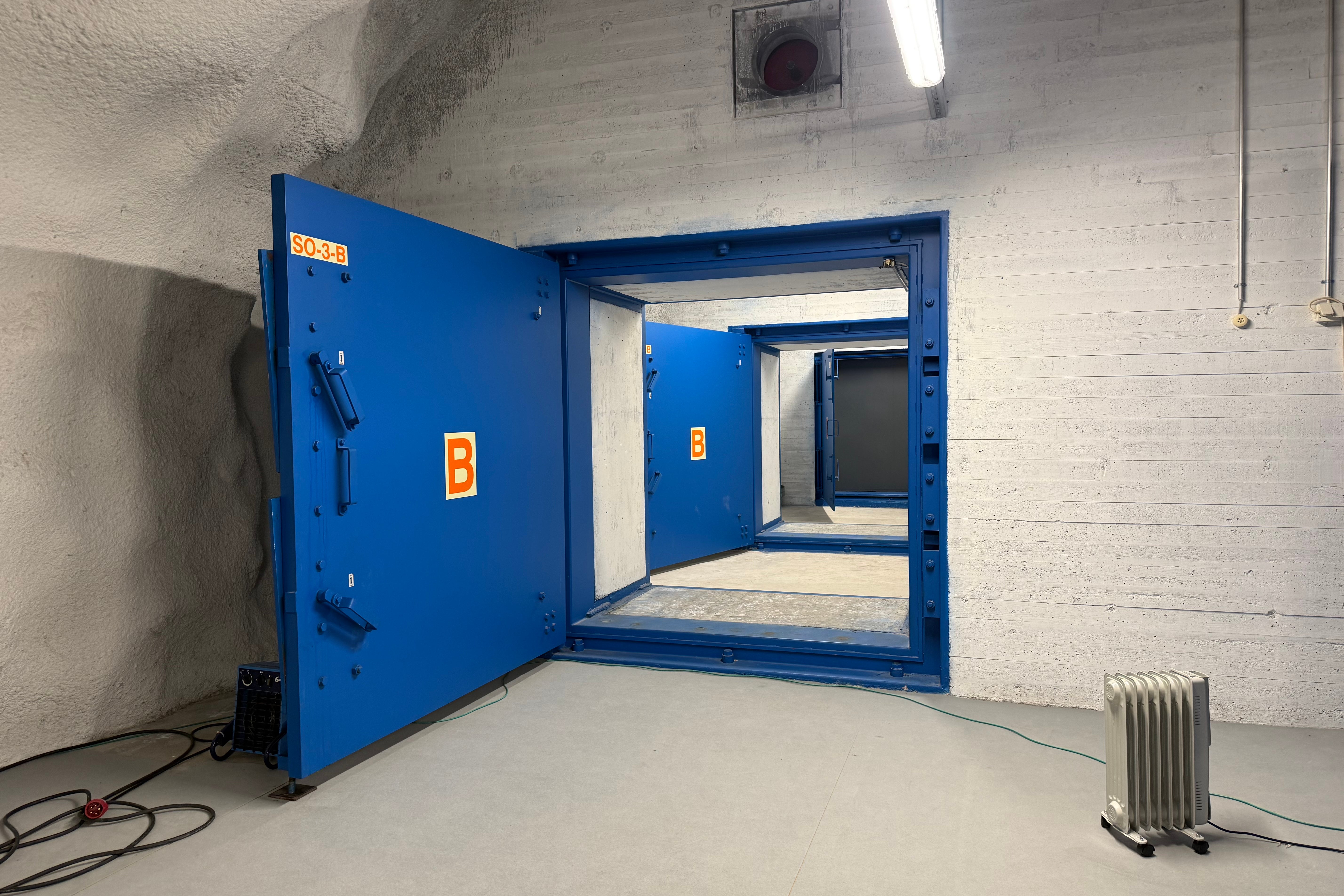 A thick granite wall designed to withstand multiple blasts separates the two heavy metal doors at the entrance to Merihaka shelter in central Helsinki.