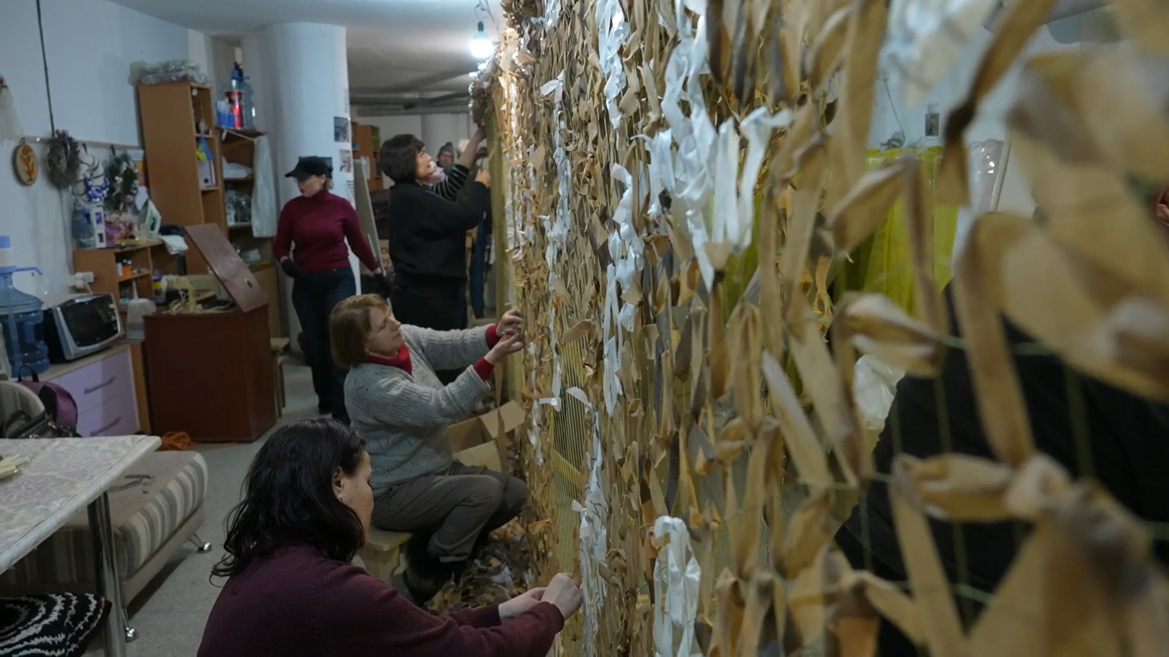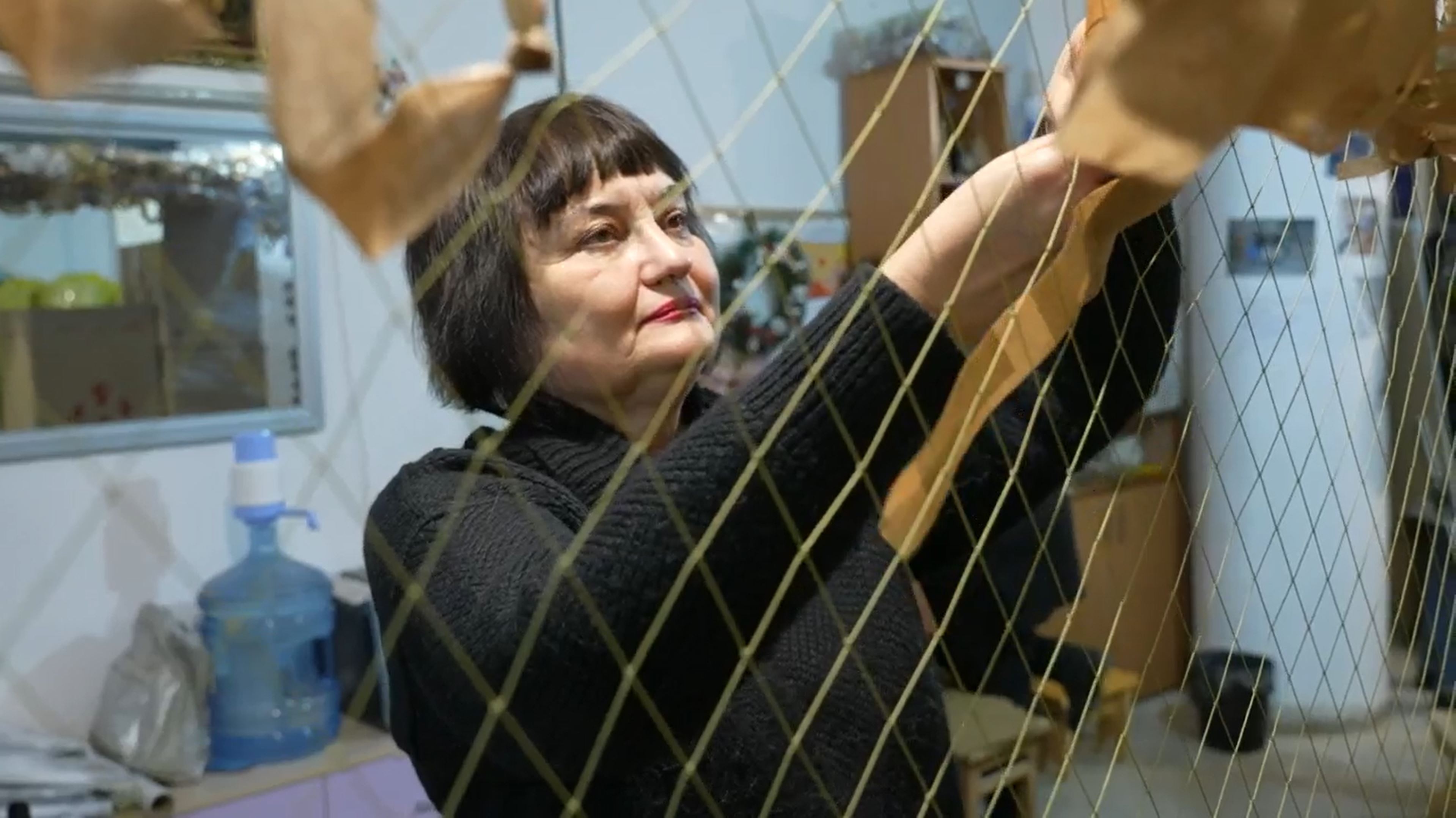 Nina Levaya volunteers for a group that weaves camouflage netting in a small workshop in Kyiv.