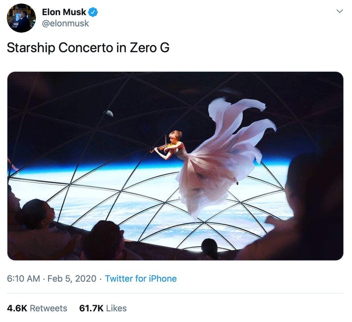 SpaceX CEO Elon Musk shared in February 2020 an image of how Starship could be used to host zero-gravity concertos during these missions.