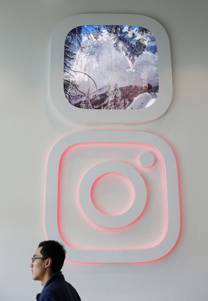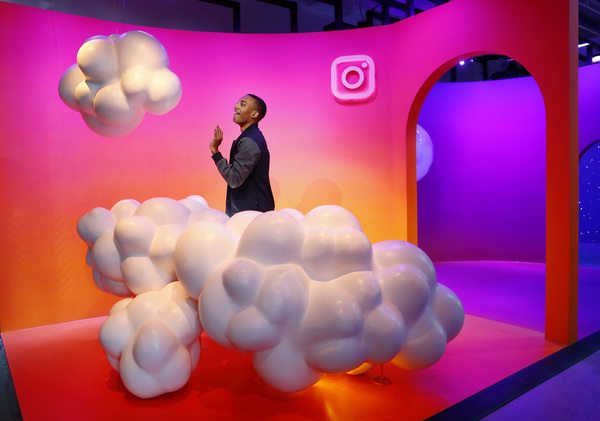 In the lobby, a large illuminated Instagram logo is displayed on a white wall along with a large feed that shows videos and photos posted on the site, from breakfast foods to outdoor adventures. Inside, employees and visitors snap photos behind a large cloud, a moon or flickering stars.