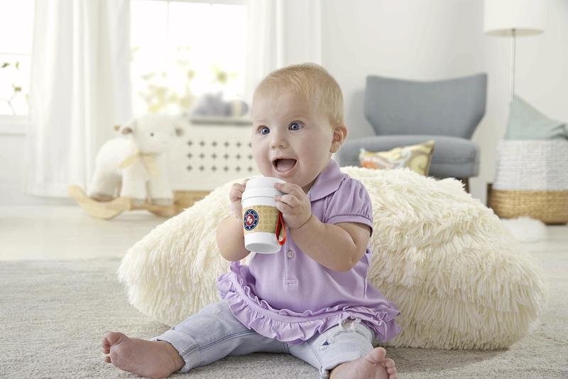 This toy is a combination of a teether and rattle and is designed to make your baby look as though they're drinking coffee when biting it. It also produces a sound when shaken.