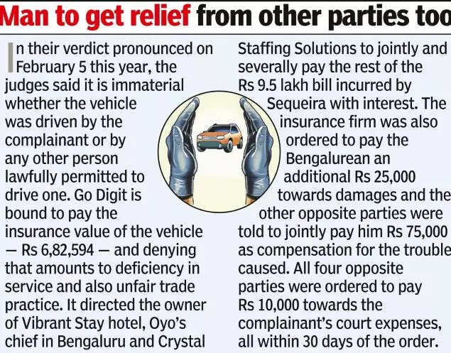 With damage to his car estimated at Rs 9.5 lakh but his insurance value only Rs 6.8 lakh, the Bengalurean was in a fix as the insurer denied his rightful claim and the hotel owner was not cooperating. Finally in November 2020, Sequeira approached the Bengaluru Rural and Urban 1st additional district consumer disputes redressal forum in Shantinagar with a complaint against Go Digit General Insurance Limited, the owner of Vibrant Stay hotel, Oravel Stays Private Limited, as hotel aggregator Oyo was earlier known, and Crystal Staffing Solutions in Kochi which had provided parking attendants for the hotel.