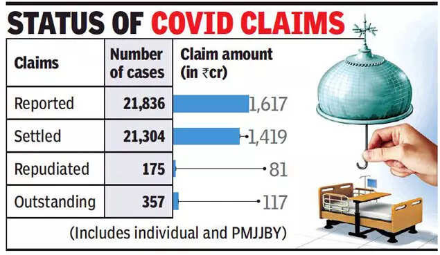 HYDERABAD: Insurance companies received 21,836 individual and PMJJBY (Pradhan Mantri Jeevan Jyoti Bima Yojana) Covid claims amounting to Rs 1,617 crore in FY21 ended March 31, 2021, of which 357 claims amounting to Rs 117 crore remain unsettled, revealed the latest annual report of IRDAI.