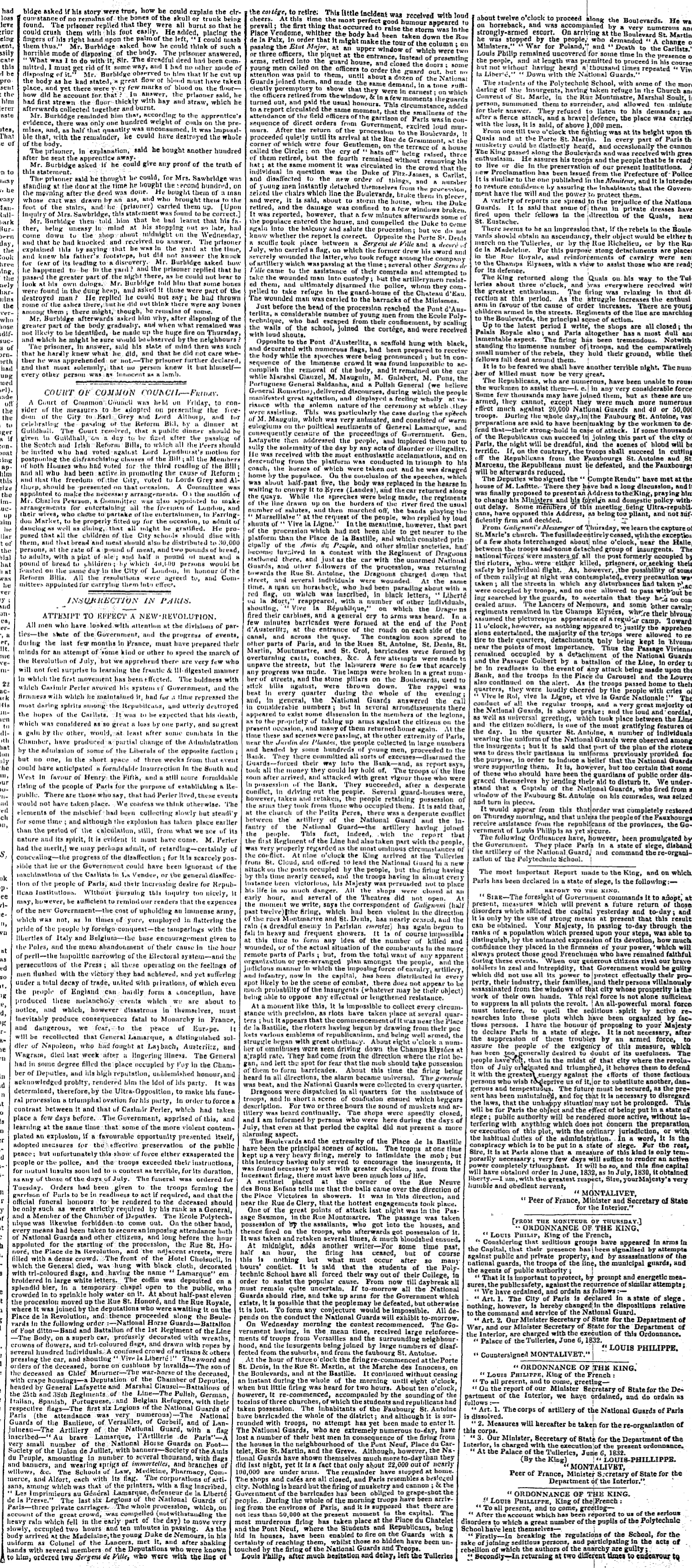 The funeral of General Lamarque has not passed over without an effusion of blood. What we can say at present with certainty is, that the attempt, whether revolution of counter-revolution, has failed. Some agitators, among whom, in the midst of a multitude difficult to characterise, we remarked some uniforms of the national and of the artillery of the national guard and some students of public schools, amidst cries of ‘Vive la Republique’ fired upon the national guard and the troops of the line, and at first took possession of several posts, particularly the bank, the Boulevard Bonne Nouvelle, the royal printing office, and some others. They began to construct barricades upon several points by stopping and overthrowing carriages, and forcing the inhabitants of the houses to give them materials. It was in fact an open and armed revolt, and we may estimate the number of persons who took part in it at 1,500 to 2,000.
