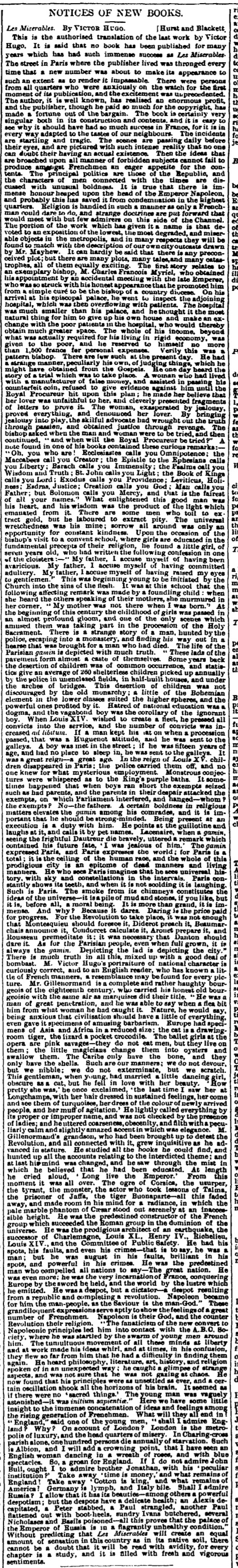 It is said that no book has been published for many years which has had such immense success as Les Miserables. The principal politics are those of the Republic, and the characters of men connected with the times are discussed with unusual boldness. It is true that there is immense honour heaped upon the head of the Emperor Napoleon, and probably this has saved it from condemnation in the highest quarters. Religion is handled in such a manner as only a Frenchman could dare to do, and strange doctrines are put forward that would meet with but few admirers on this side of the Channel.