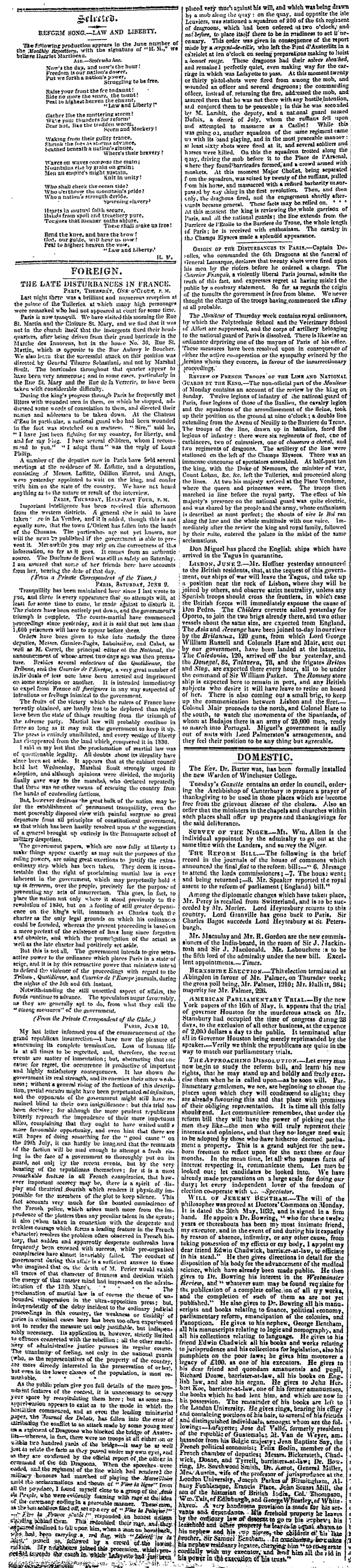 General Lamarque’s funeral procession took place on Tuesday morning. Notwithstanding an unfavourable state of the weather, several thousand persons attended the obsequies of this republican politician, though Napoleonist soldier, and the whole of the windows, terraces, and balconies along the boulevard, commencing from the church of La Madeleine, were filled chiefly with elegantly dressed females, who seemed anxious to view that ceremony. The cortège, of course was chiefly composed of persons professing what are still called liberal opinions.