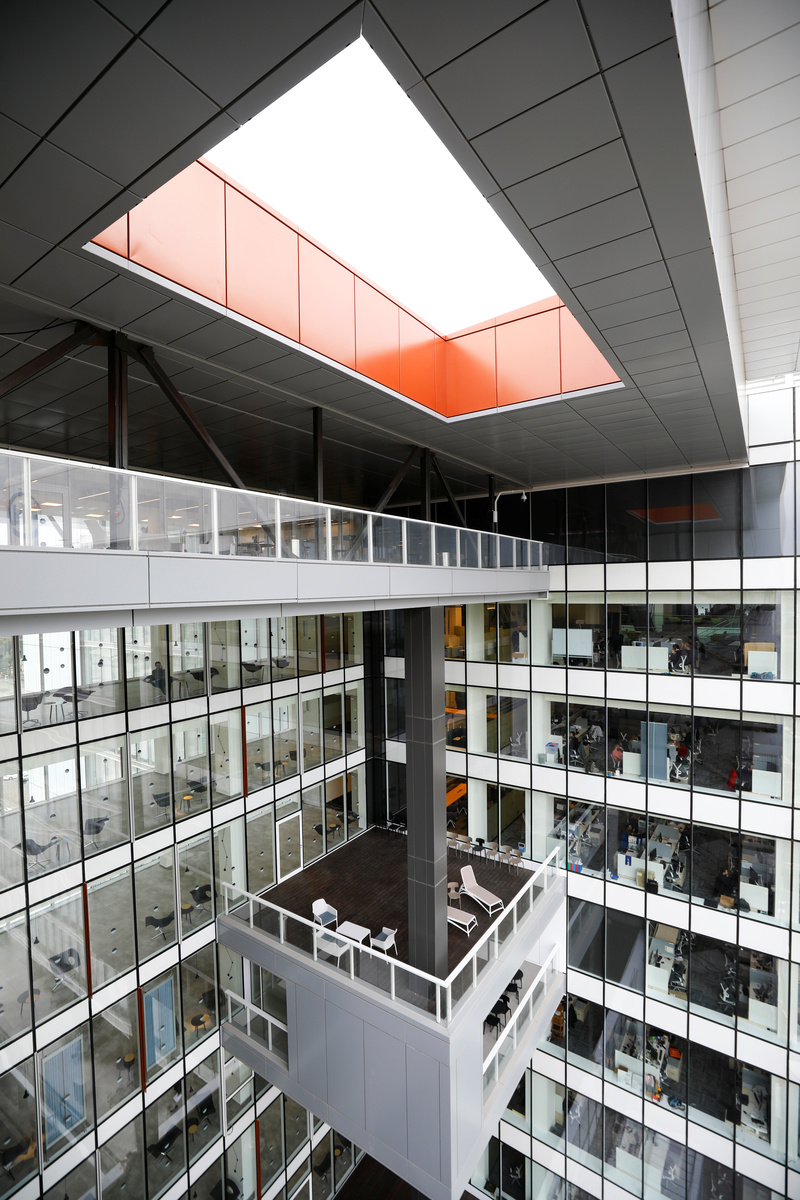 The building has an open-space format. An atrium in the center is roofed by skylights, and caps the five top floors. Health-conscious employees often use the internal stairs in the atrium instead of the elevator.