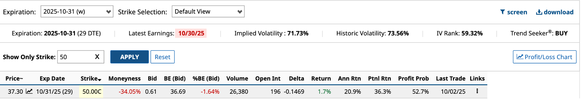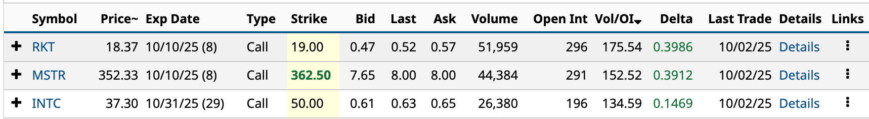As I mentioned in the introduction, Intel’s Oct. 31 $50 call had a Vol/OI ratio of 134.59, the third-highest on the day, one of seven with a ratio of 100 or higher.