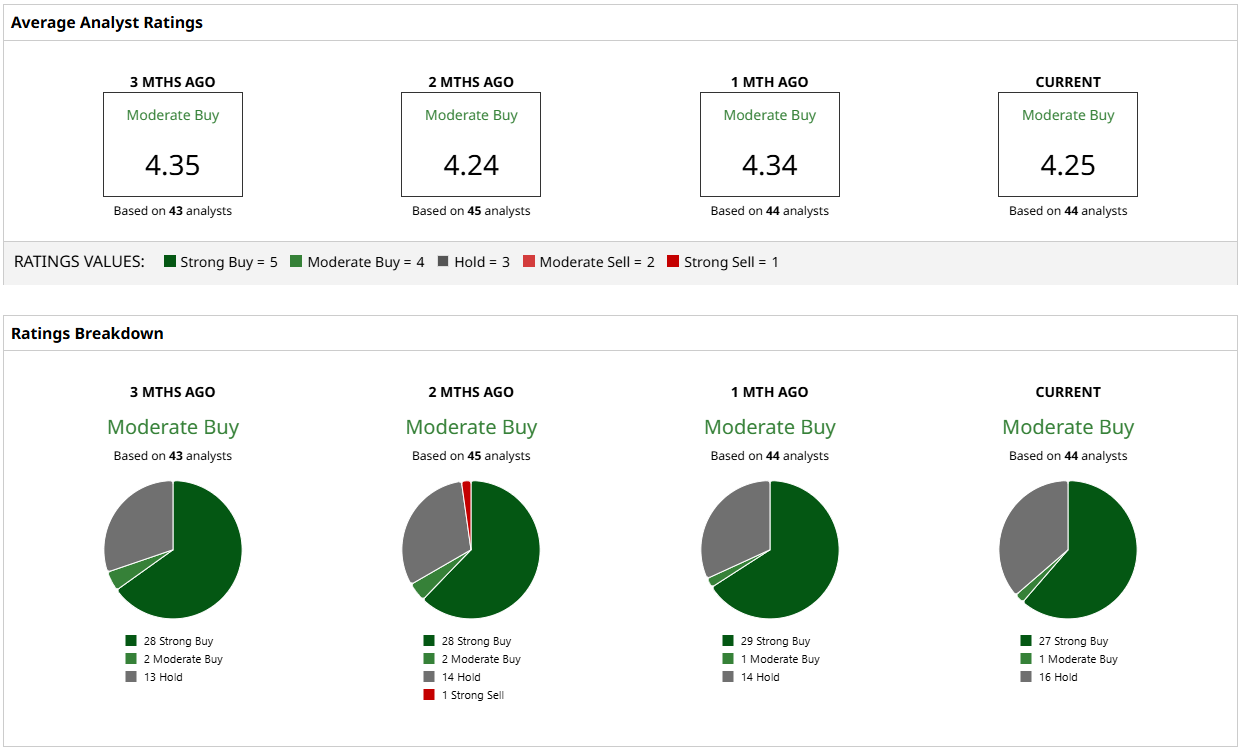 AMD is a popular stock, so it gets a lot of attention from analysts. Forty-four are currently covering it, and the consensus sentiment is bullish—27 rate it a “Strong Buy,” one a “Moderate Buy,” and the other 16 say “Hold.”