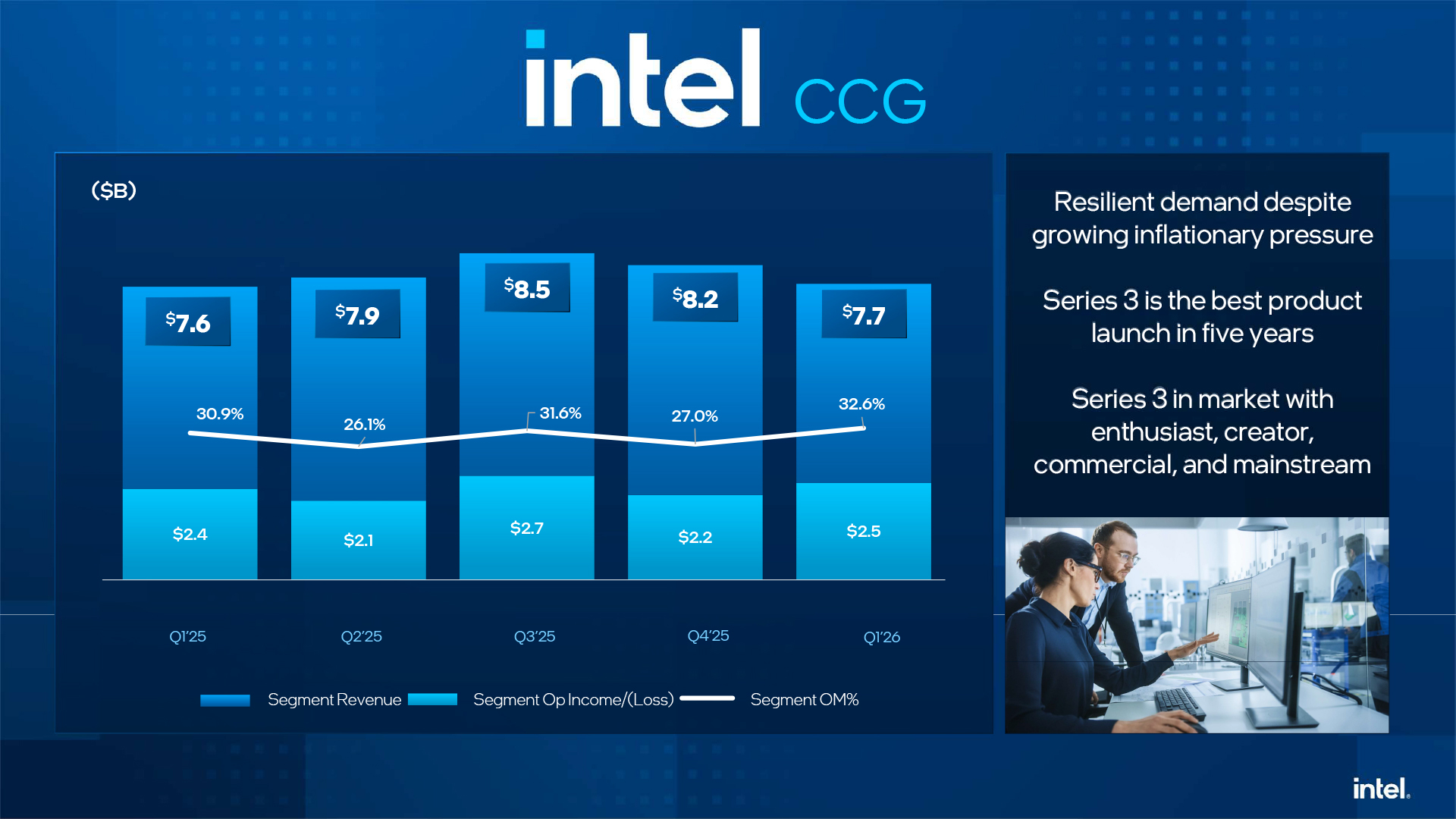 The Client Computing Group (CCG) generated $7.7 billion in revenue, $2.5 billion operating income, and 32.6% operating margin in Q1 2025, which is clearly up from $7.6 billion revenue, $2.4 billion operating income, and 30.9% operating margin in the same quarter a year ago. Keeping in mind that sales of PCs in the first quarter were affected by the turmoil on the DRAM and storage markets as well as demand outstripping supply (partly because Intel continues to shift some capacity from client to data center products) CCG's results can be considered good.