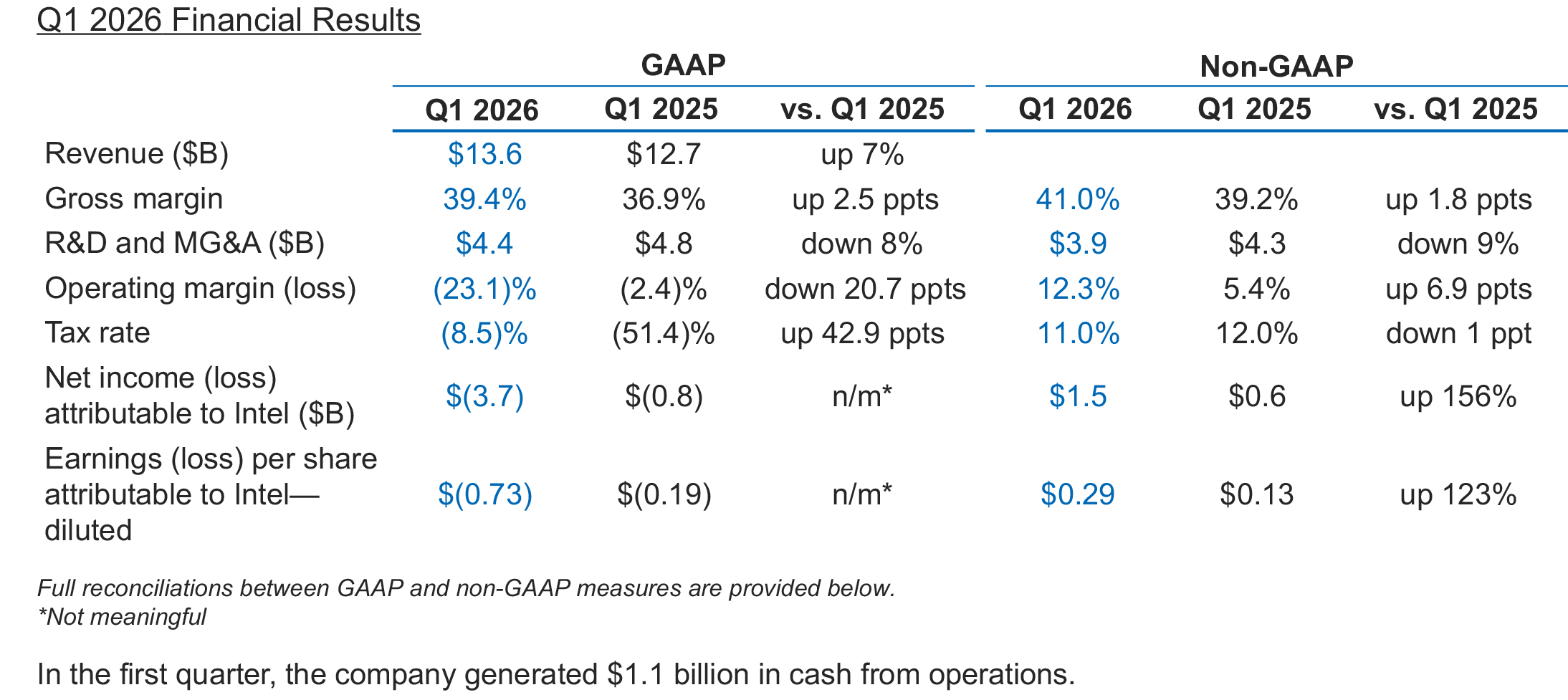 In the first quarter of 2026, Intel earned $13.6 billion in revenue, up 7% year-over-year (YoY), and flat with the fourth quarter of 2025, meaning that the results are well above seasonality. The company's R&D and SG&A expenses totaled $4.4 billion, down 8% from $4.8 billion in the same quarter a year ago, whereas its gross margin increased to 39.4% from 36.9% in Q1 2025. In addition, Intel generated $1.1 billion in cash from operations. Nonetheless, the company recorded a $3.7 billion GAAP loss in the first quarter of 2026, up massively from $800 million in Q1 2025.