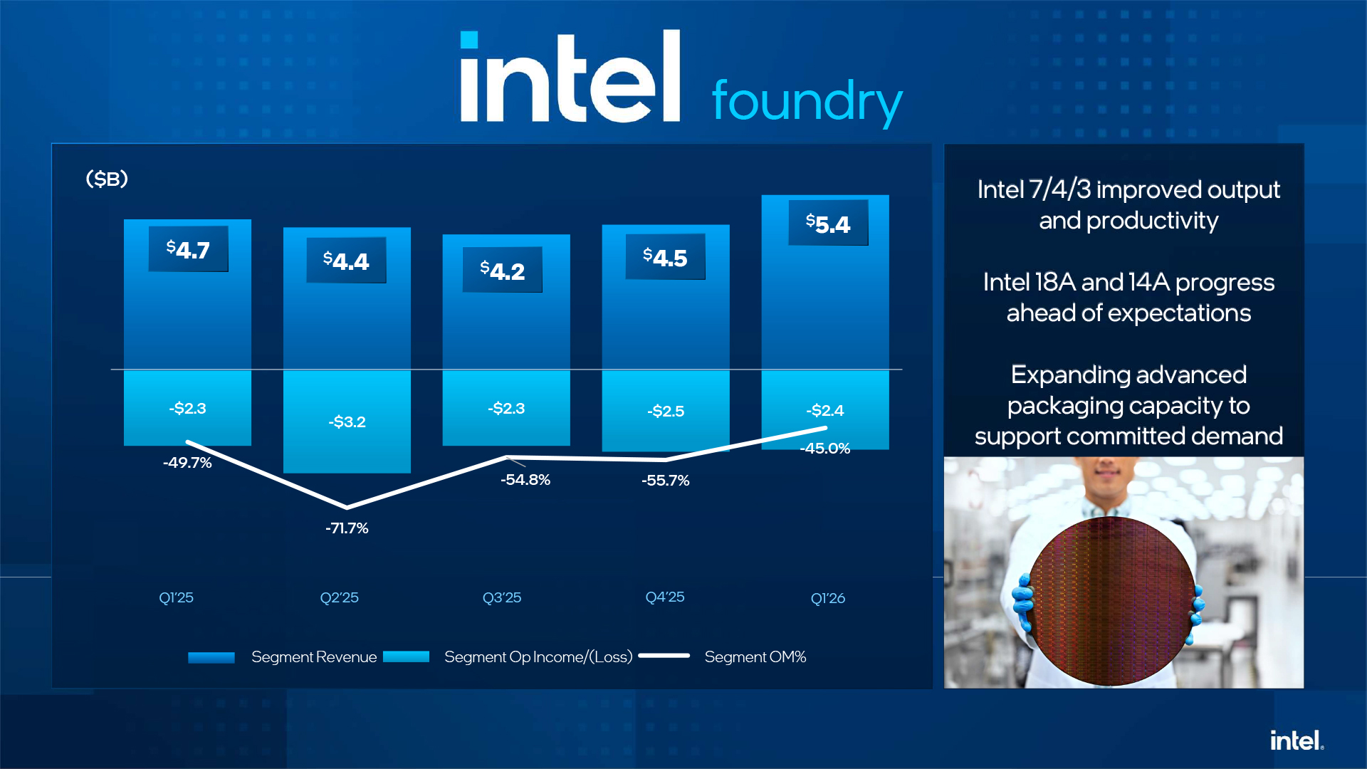 Intel's Foundry division produces the company's most profitable products for client and data center applications and also absorbs all the losses of the company. The division generated $5.4 billion in revenue last quarter (up from $4.7 billion in Q1 2025), but posted an operating loss of roughly $2.4 billion (up from $2.3 billion in Q1 2025), which means an operating margin near -45%.