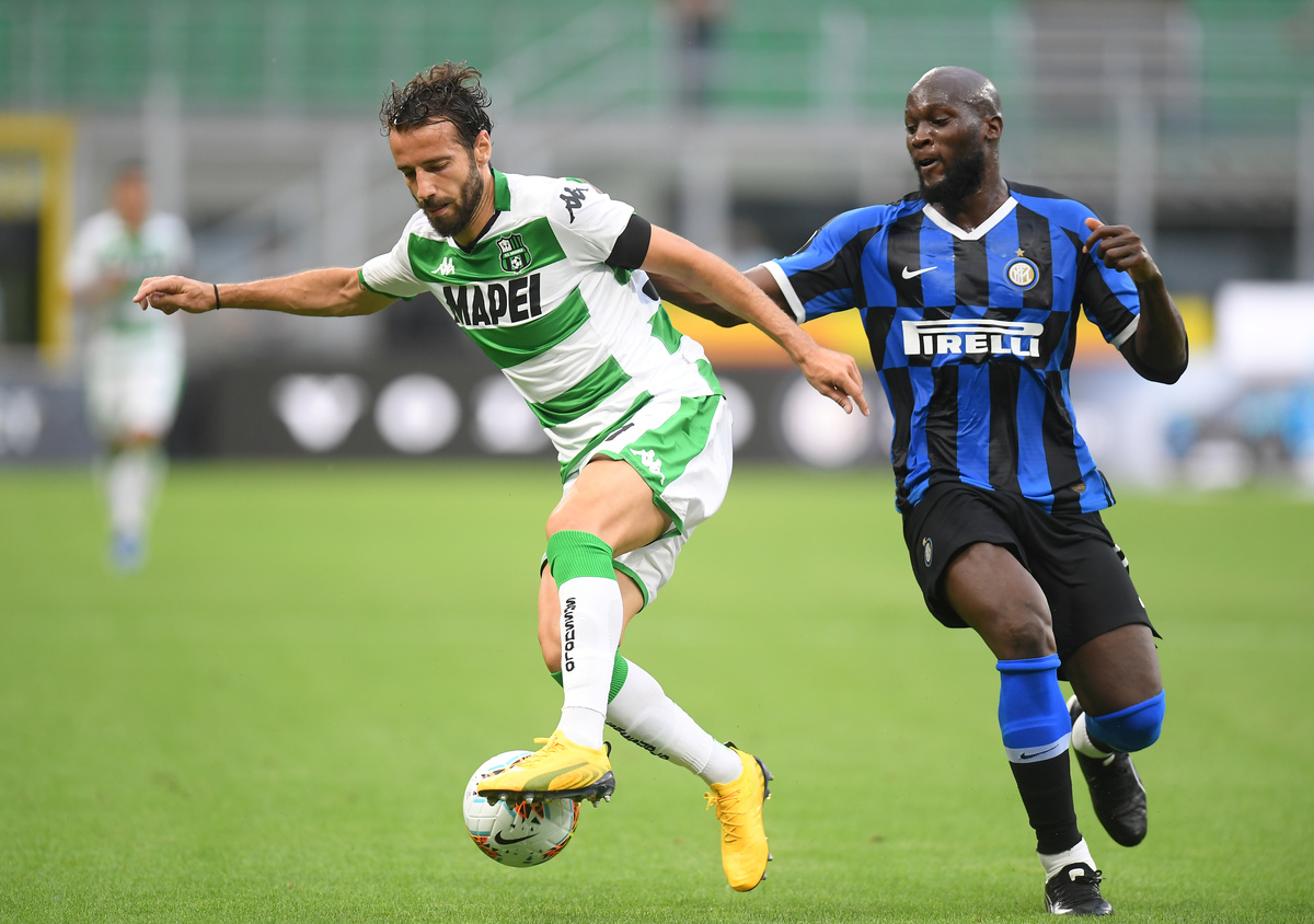 Soccer Football - Serie A - Inter Milan v U.S. Sassuolo - San Siro, Milan, Italy - June 24, 2020 Sassuolo's Gian Marco Ferrari in action with Inter Milan's Romelu Lukaku as play resumes behind closed doors following the outbreak of the coronavirus disease (COVID-19) REUTERS/Daniele Mascolo