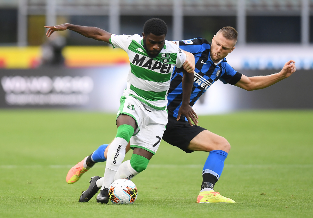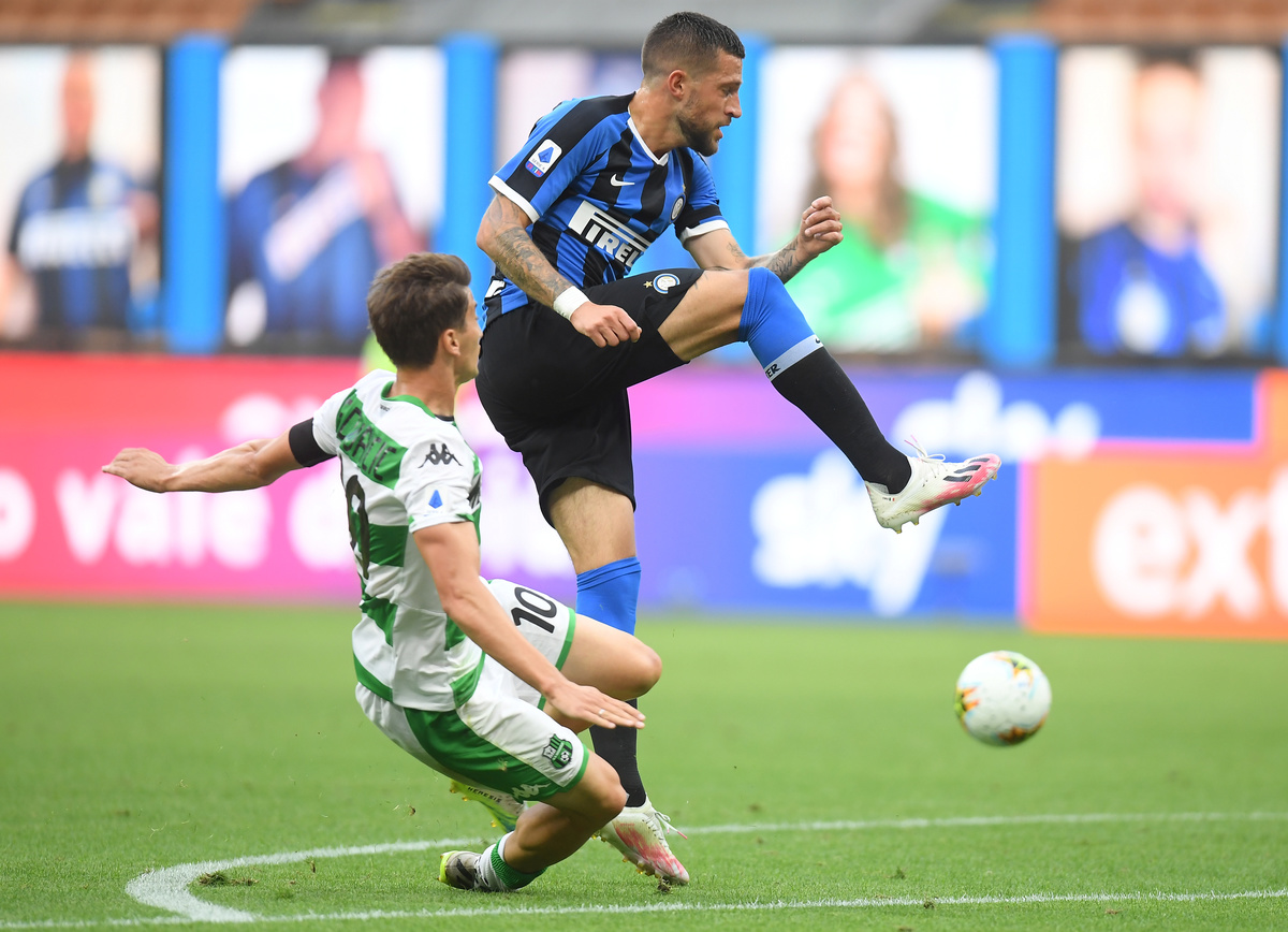 Soccer Football - Serie A - Inter Milan v U.S. Sassuolo - San Siro, Milan, Italy - June 24, 2020 Sassuolo's Filip Djuricic in action with Inter Milan's Cristiano Biraghi as play resumes behind closed doors following the outbreak of the coronavirus disease (COVID-19) REUTERS/Daniele Mascolo