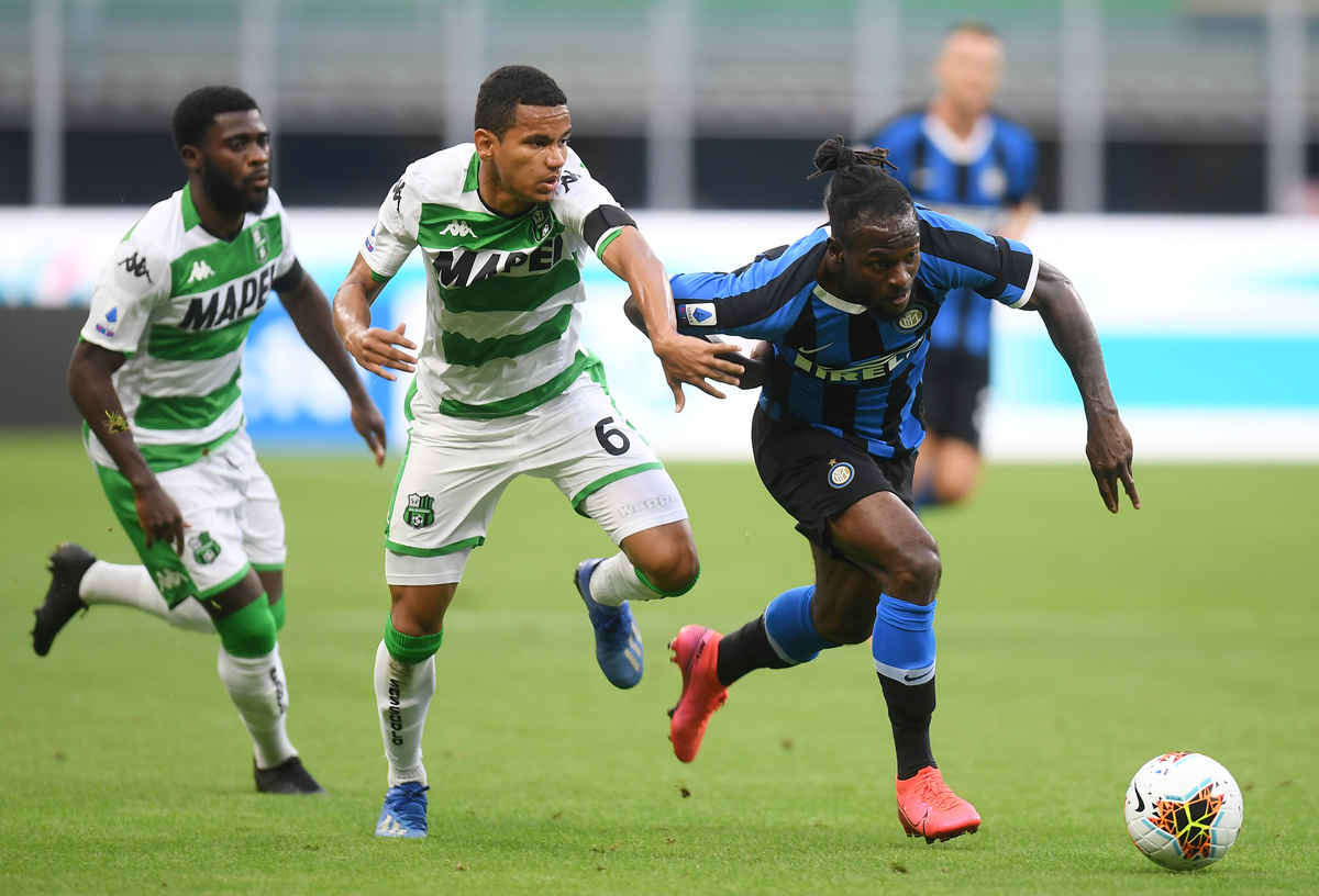 Soccer Football - Serie A - Inter Milan v U.S. Sassuolo - San Siro, Milan, Italy - June 24, 2020 Sassuolo's Domenico Berardi celebrates scoring their second goal,as play resumes behind closed doors following the outbreak of the coronavirus disease (COVID-19) REUTERS/Daniele MascoloSoccer Football - Serie A - Inter Milan v U.S. Sassuolo - San Siro, Milan, Italy - June 24, 2020 Inter Milan's Romelu Lukaku scores their first goal from the penalty spot as play resumes behind closed doors following the outbreak of the coronavirus disease (COVID-19) REUTERS/Daniele MascoloSoccer Football - Serie A - Inter Milan v U.S. Sassuolo - San Siro, Milan, Italy - June 24, 2020 Sassuolo's Giangiacomo Magnani celebrates scoring their third goal, as play resumes behind closed doors following the outbreak of the coronavirus disease (COVID-19) REUTERS/Daniele MascoloSoccer Football - Serie A - Inter Milan v U.S. Sassuolo - San Siro, Milan, Italy - June 24, 2020 Inter Milan coach Antonio Conte celebrates after Borja Valero scored their third goal, as play resumes behind closed doors following the outbreak of the coronavirus disease (COVID-19) REUTERS/Daniele MascoloSoccer Football - Serie A - Inter Milan v U.S. Sassuolo - San Siro, Milan, Italy - June 24, 2020 Sassuolo's Rogerio in action with Inter Milan's Victor Moses as play resumes behind closed doors following the outbreak of the coronavirus disease (COVID-19) REUTERS/Daniele MascoloSoccer Football - Serie A - Inter Milan v U.S. Sassuolo - San Siro, Milan, Italy - June 24, 2020 Sassuolo's Vlad Chiriches in action with Inter Milan's Alexis Sanchez as play resumes behind closed doors following the outbreak of the coronavirus disease (COVID-19) REUTERS/Daniele MascoloSoccer Football - Serie A - Inter Milan v U.S. Sassuolo - San Siro, Milan, Italy - June 24, 2020 Sassuolo's Francesco Magnanelli in action with Inter Milan's Christian Eriksen as play resumes behind closed doors following the outbreak of the coronavirus disease (COVID-19) REUTERS/Daniele MascoloSoccer Football - Serie A - Inter Milan v U.S. Sassuolo - San Siro, Milan, Italy - June 24, 2020 Sassuolo's Jeremie Boga in action with Inter Milan's Milan Skriniar as play resumes behind closed doors following the outbreak of the coronavirus disease (COVID-19) REUTERS/Daniele Mascolo
