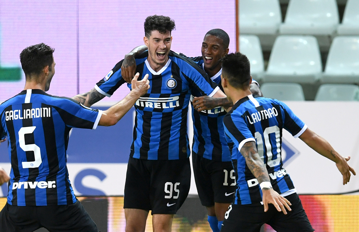 Soccer Football - Serie A - Parma v Inter Milan - Stadio Ennio Tardini, Parma, Italy - June 28, 2020 Inter Milan's Alessandro Bastoni celebrates scoring their second goal with teammates, as play resumes behind closed doors following the outbreak of the coronavirus disease (COVID-19) REUTERS/Jennifer Lorenzini