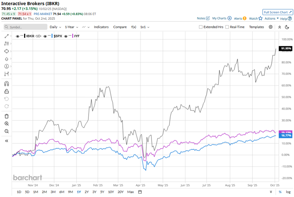 Shares of Interactive Brokers have climbed nearly 99% over the past 52 weeks, surpassing the S&P 500 Index's ($SPX) 17.6% increase and the iShares U.S. Financials ETF's (IYF) 20.9% return over the same period.