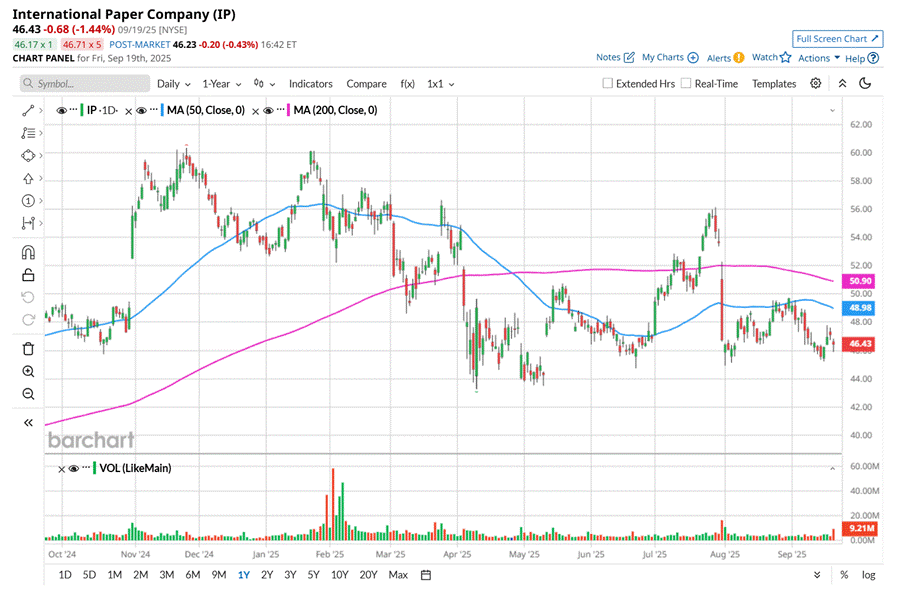 To confirm its bearish trend, IP has been trading below its 200-day moving average since early April, with slight fluctuations, and has remained below its 50-day moving average since late July, with minor fluctuations.