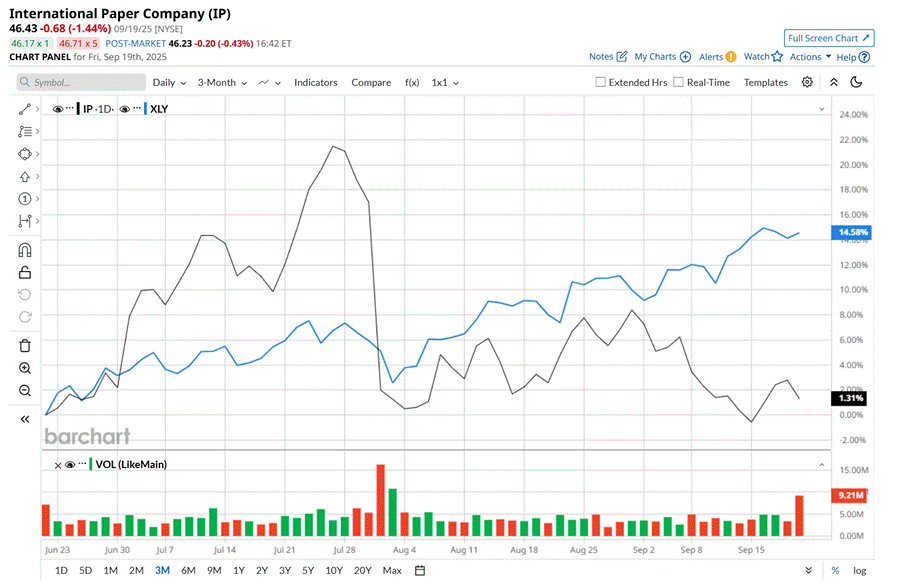 This packaging company has slipped 23.1% from its 52-week high of $60.36, reached on Nov. 25, 2024. Shares of IP have gained marginally over the past three months, considerably underperforming the Consumer Discretionary Select Sector SPDR Fund’s (XLY) 14.7% return during the same time frame.