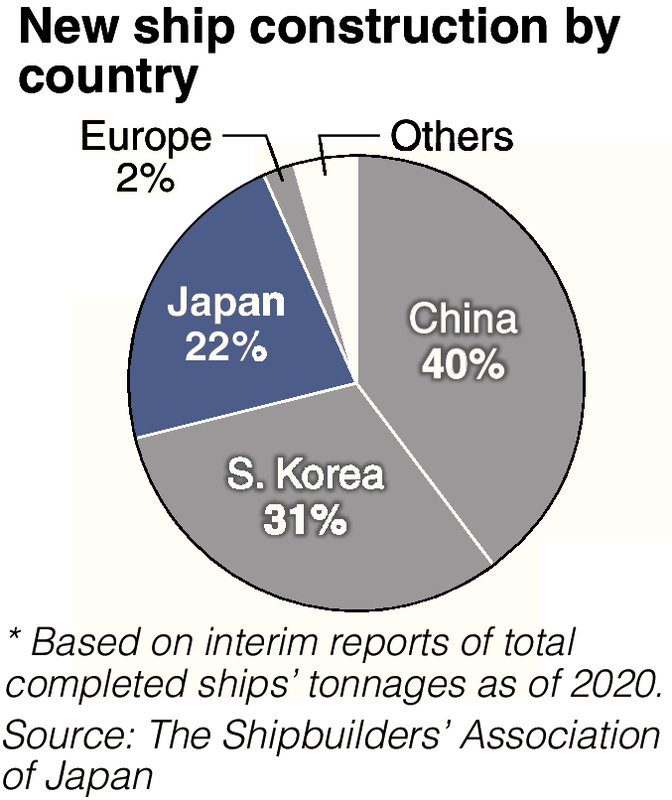 Japan's market share of newly built ships in the 1980s was No. 1 in the world at about 50%, but that figure fell to 22% in 2020. Japan is currently third, after China with 40% and South Korea with 31%.
