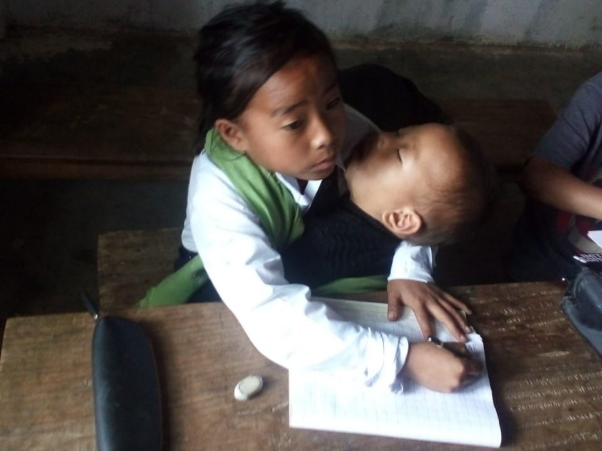 This 10-year-old girl named Meiningsinliu Pamei from Tamenglong, Manipur attends school babysitting her sister, as her parents were out for farming & studies while keeping her younger sister in her lap."