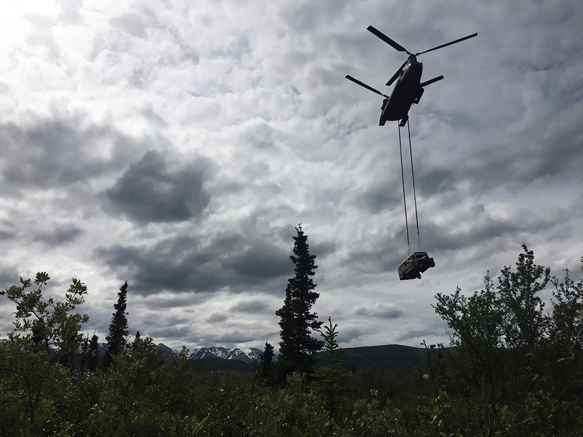The Alaska Department of Natural Resources and Alaska Army National Guard worked jointly to remove the 1940s-era bus.