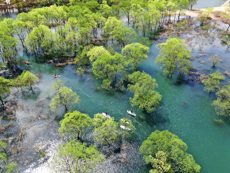 The spectacle of a "submerged forest" has appeared at the Shirakawa Lake in Iide, Yamagata Prefecture, creating a fantastic scene of lush green leaves and white willow trees reflected on the water with canoes cruising under the azure sky.