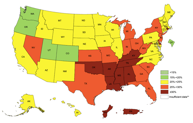 The maps show over 15 percent of adults in every single state report leading a sedentary lifestyle, which means a lifestyle that involves little to no physical activity whatsoever. Instead of walking the dog or going on a hike, it seems like a lot of Americans are sitting at home on the couch, in their cars, or at their desks.