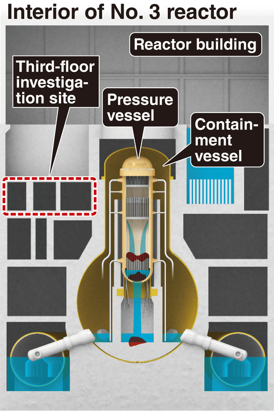 Of reactors No. 1, 2 and 3, which were all hit by nuclear meltdown, the buildings of reactors No. 1 and 3 were destroyed by hydrogen explosions. Radiation levels in the upper part of the No. 3 reactor building were extremely high at specific points compared with those in reactor buildings No. 1 and 2. The location of the radioactive source at the No. 3 reactor is unknown.