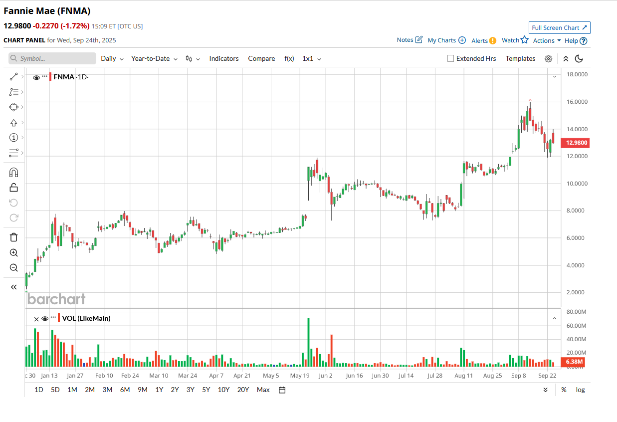 Fannie Mae, however, is the larger of the two, with a market capitalization of approximately $15.1 billion. Investor excitement has surged as discussions about its potential privatization heat up, sending shares on a remarkable run. Over the past year, FNMA has delivered a staggering 953% return, and this year alone, the stock has climbed another 298%, reflecting Wall Street’s growing optimism and the high stakes surrounding its future.