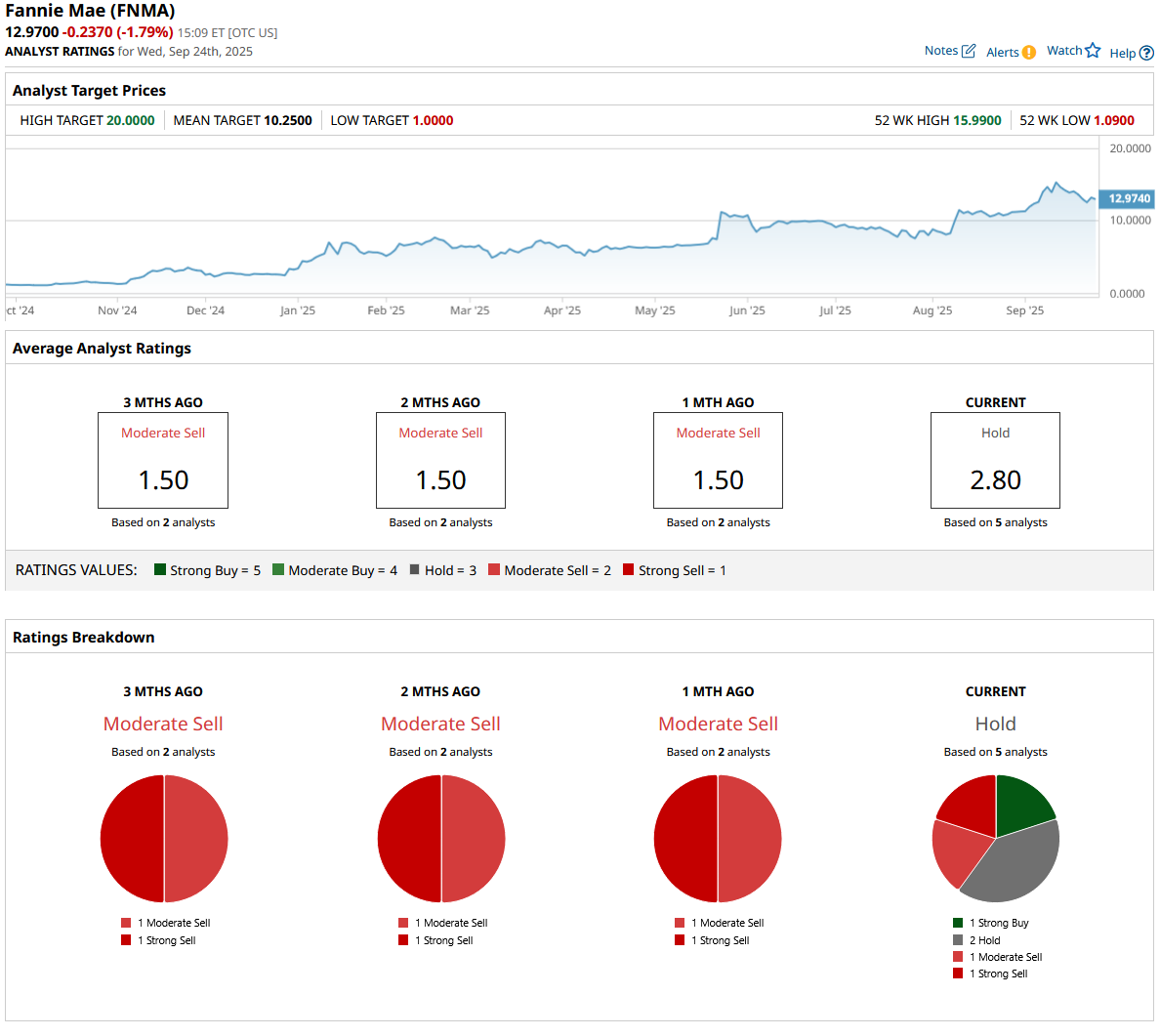 Overall, Wall Street has largely taken a cautious, wait-and-see approach to Fannie Mae, reflected in its consensus “Hold” rating. Among the five analysts covering FNMA, opinions are clearly divided. Only one analyst sees it as a “Strong Buy,” two recommend a “Hold,” one leans toward a “Moderate Sell,” and another has issued a “Strong Sell.”
