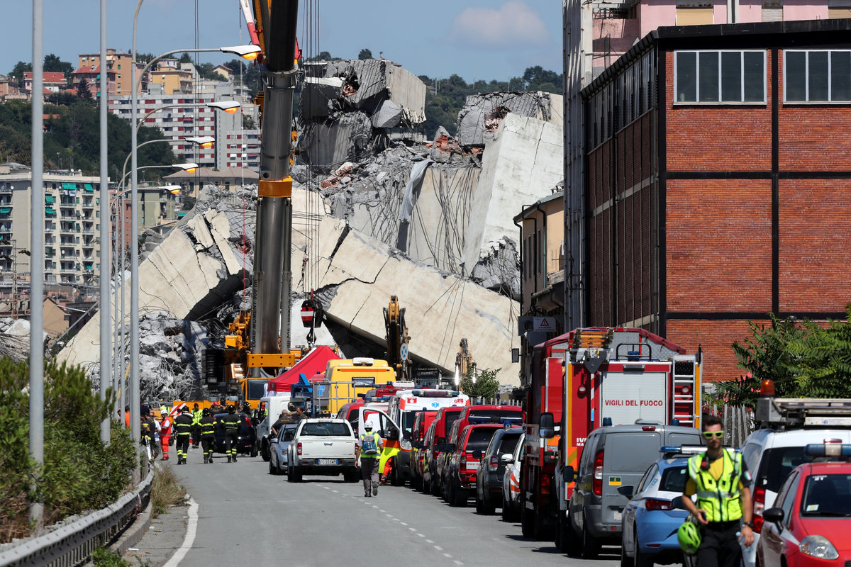 A section of the bridge gave way on Tuesday in busy lunchtime traffic, plunging dozens of vehicles 50m (160 feet) below and engulfing Autostrade per l'Italia into a political fire storm.