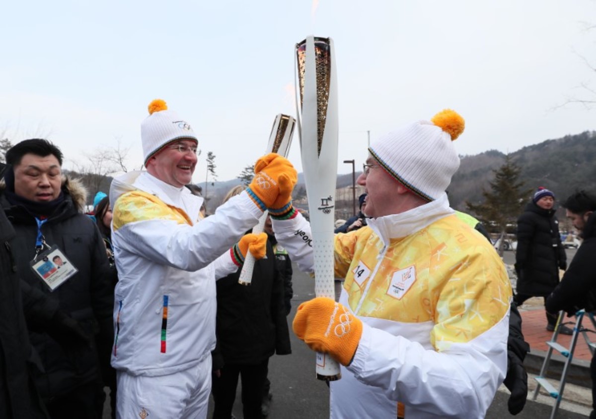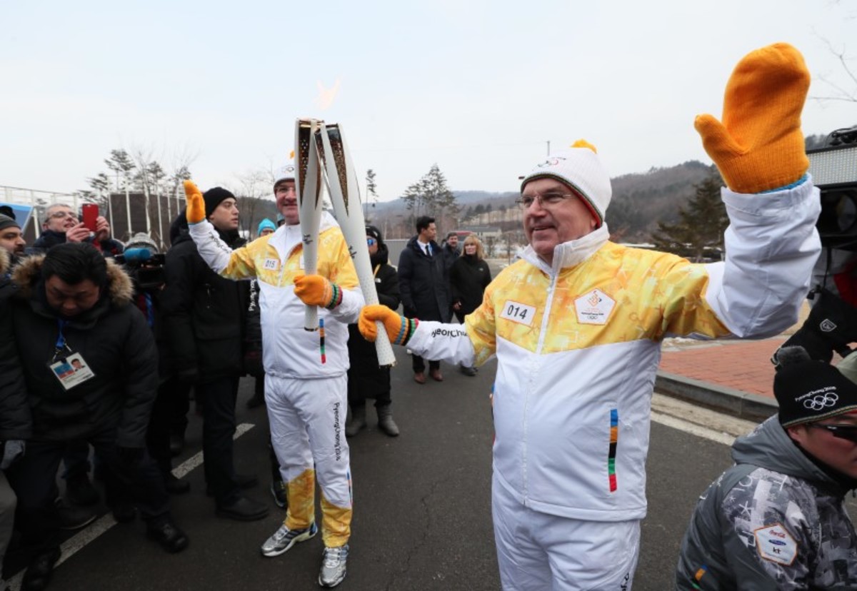 Bach, a former Olympic fencing champion, ran the torch relay early in the morning in Pyeongchang, receiving the Olympic flame from a local teenager, whom the German also invited to the ceremony later in the day.