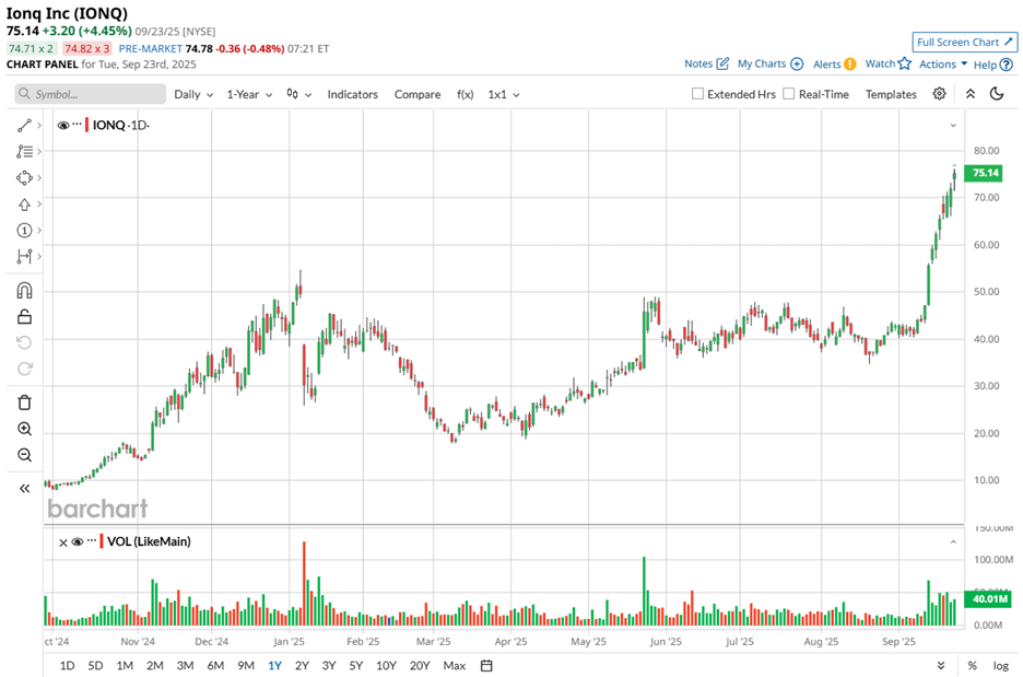 In the last month alone, IONQ stock has raced ahead by 65%. It even jumped 18.2% on Sept. 12 after securing U.K. clearance for its $1 billion Oxford Ionics acquisition.