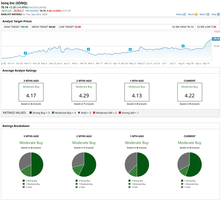 Analysts tracking IONQ maintain a constructive stance, with the stock holding a consensus rating of “Moderate Buy.” Out of nine analysts covering the stock, five call for “Strong Buy,” one favors “Moderate Buy,” and three suggest to “Hold."