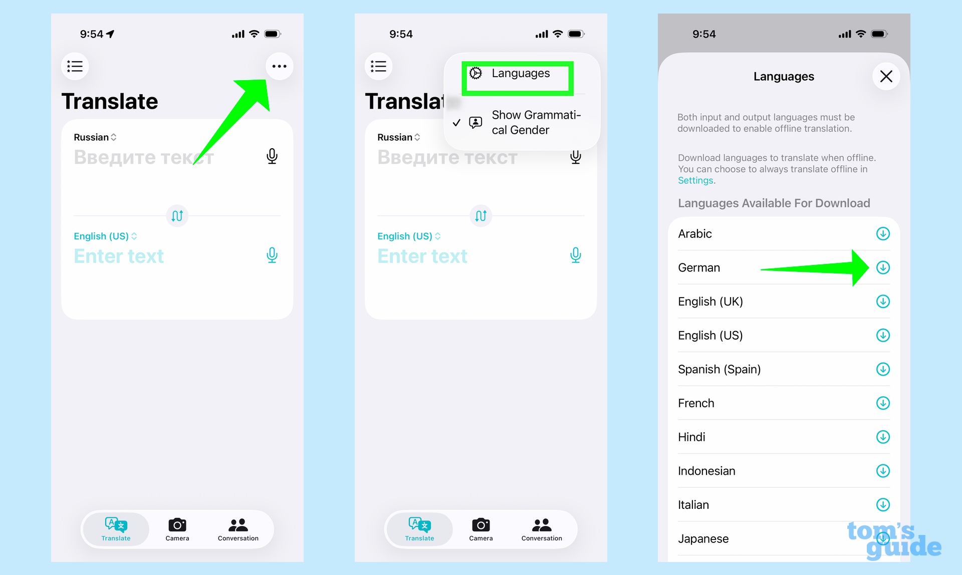 You can make sure that you already have a language preinstalled by launching your iPhone's built-in Translate app and tapping the More menu in the right corner. (It's the three horizontal dots.) On the pop-up menu, select languages and then on the next screen, tap the download arrow next to the language you want to install.