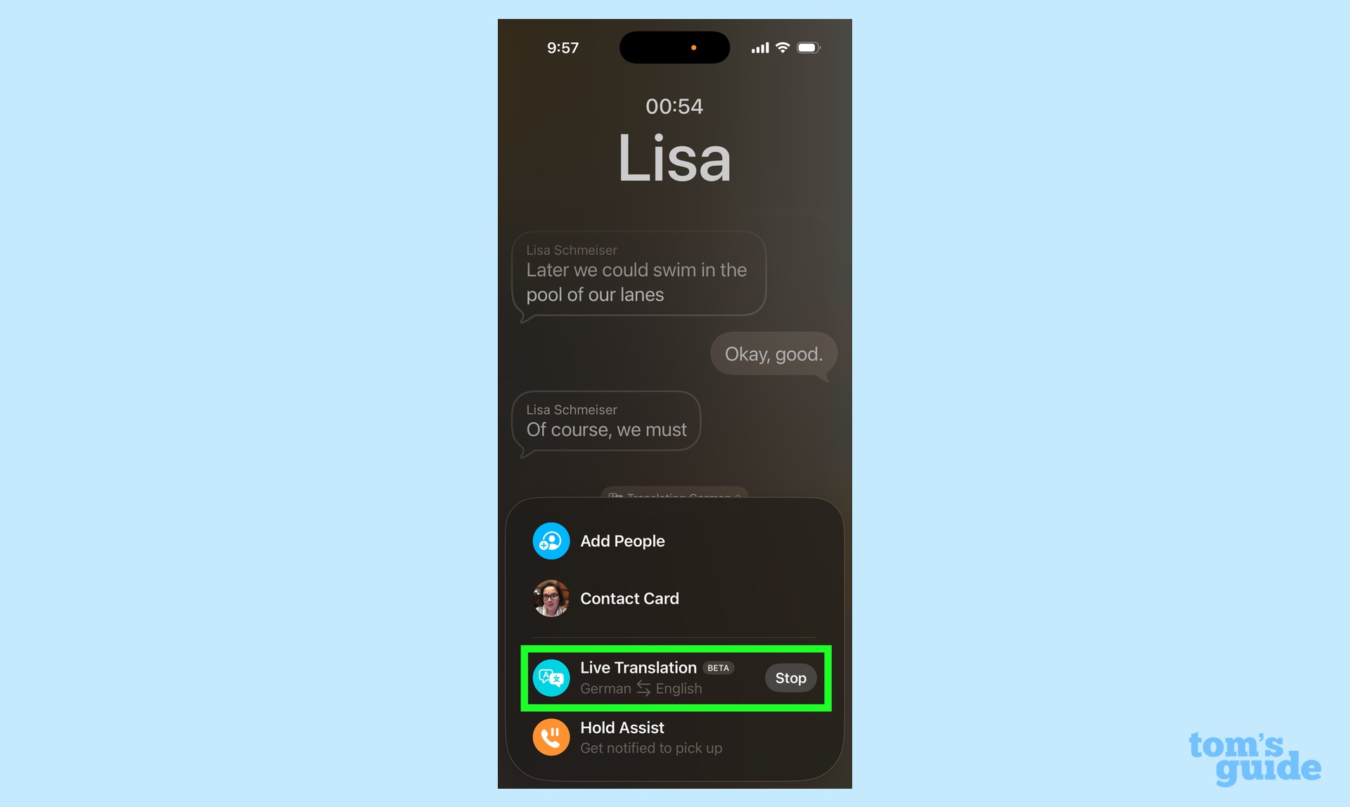 When you're in a phone call and you need real-time translations, tap the More button on the call screen. From the menu that pops up, tap Live Translations.