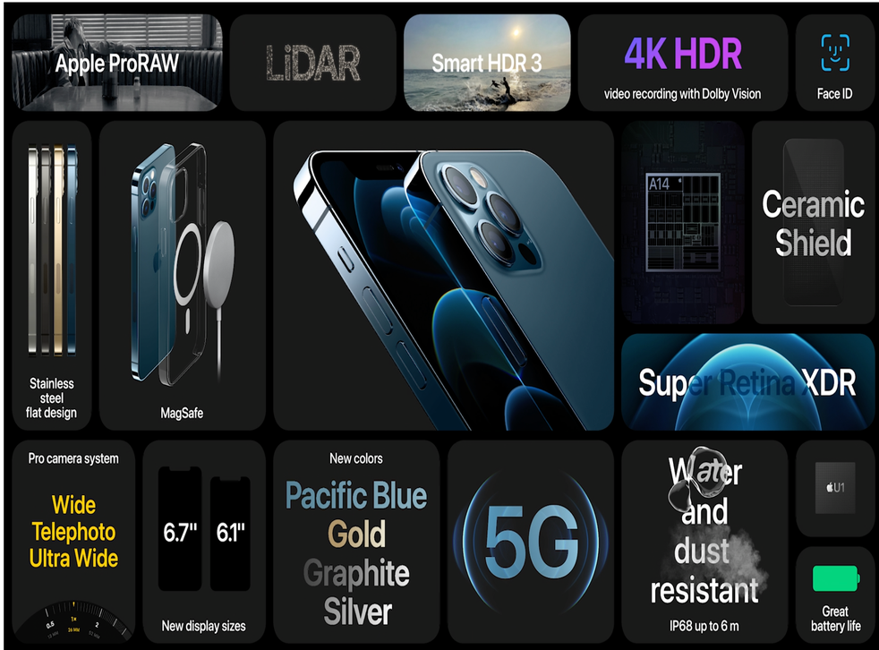 In addition to the features found on the normal iPhone 12, the Pro models comes in a range of more expensive finishes. It also has a vastly improved camera, keeping the three lens system found in last year’s Pro models.