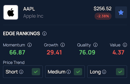 Benzinga's Edge Stock Rankings place Apple in the 76th percentile for Quality, reflecting solid long-term fundamentals and strong investor confidence. Click here to see how it compares to rivals.