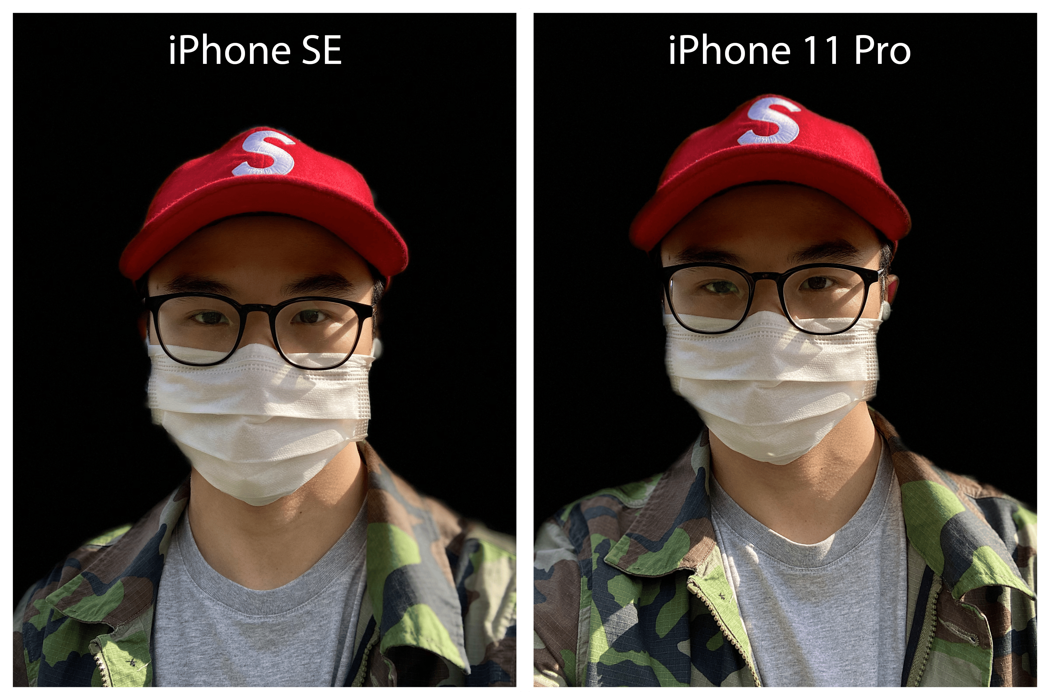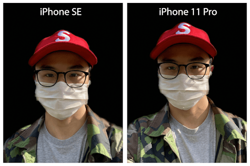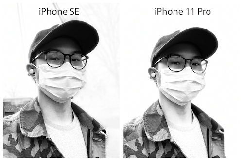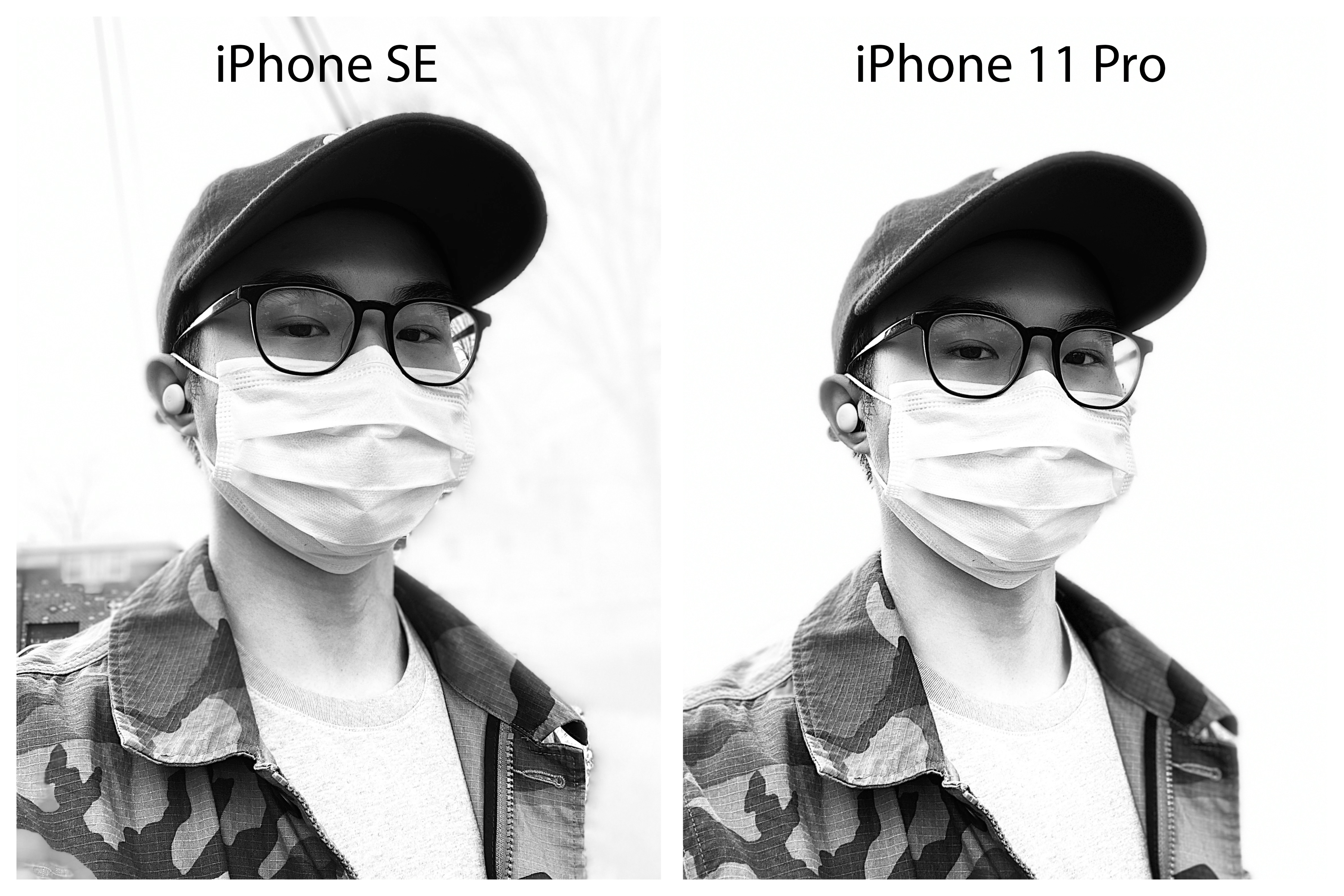 The differences are more apparent when using the other portrait lighting effects like stage light and high-key light mono. For the latter (below), you can see the iPhone SE does a better job exposing my mask and T-shirt for highlights, but gets tripped up removing the background.