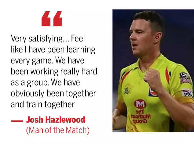 Josh Hazlewood of CSK was adjudged the Man of the Match for his figures of 3-24. He took the wickets of Jason Roy, Abhishek Sharma and Abdul Samad.