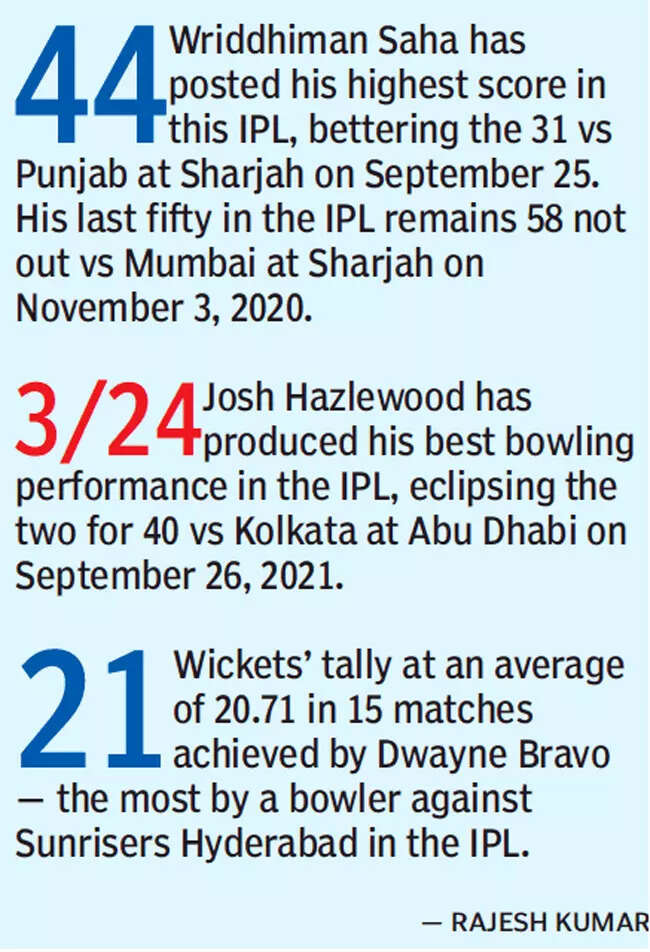 <p>Chennai now lead the eight-team table with 18 points from 11 games, two ahead of Delhi Capitals, and are guaranteed a place in the four playoff spots. (BCCI/IPL/PTI Photo)</p>Saha, however, put the innings on a revival mode before he fell. The Sunrisers were 41 for one in the powerplay as the hero of SRH's previous game, Roy, tickled Hazlewood - who returned his IPL best - to succumb cheaply. The Australian bowled good areas, inducing an edge off Kane Williamson that the skipper survived before he was trapped in front by Bravo.