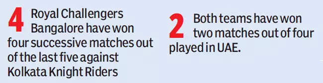 The RCB's high-profile batting unit also has a score to settle after being bowled out for 92 only, when they last played KKR. Kohli's bowlers should also be wary of the fact that KKR got 171/4, the highest score on the slow Sharjah track in their last match.